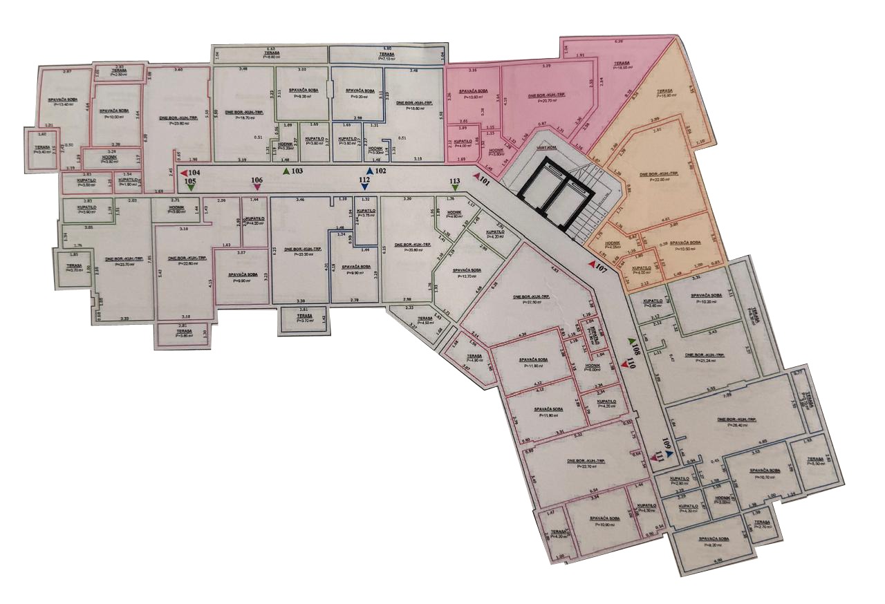 Discover this prime Ulcinj property floor plan: spacious rooms, colored layouts, hallways, stairs—exclusive at montenegro-listings.me by ekosphere doo.